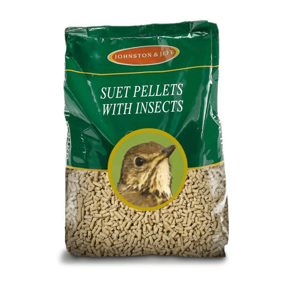 Johnston & Jeff Suet Pellets with Insects. Suet Pellets are an excellent and nutritious food, high in fats and calories which the birds need. They are a wonderful high-energy source and are easily digestible, making them great for both young and adult birds. Suet Pellets with Insects provide a source of insectivorous proteins and increase the energy levels. Feed from a bird table, ground feeder or a special Johnston & Jeff Suet Pellet Feeder.