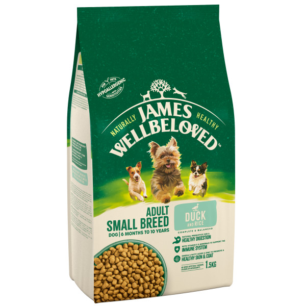 James Wellbeloved Small Breed Duck & Rice Dog Food has a small, crunchy kibble which is excellent for maintaining & improving oral health. The mixture has been formulated with beneficial fibres & easily digestible proteins to ensure that the faster metabolism of small dogs is maintained in a healthy manner.