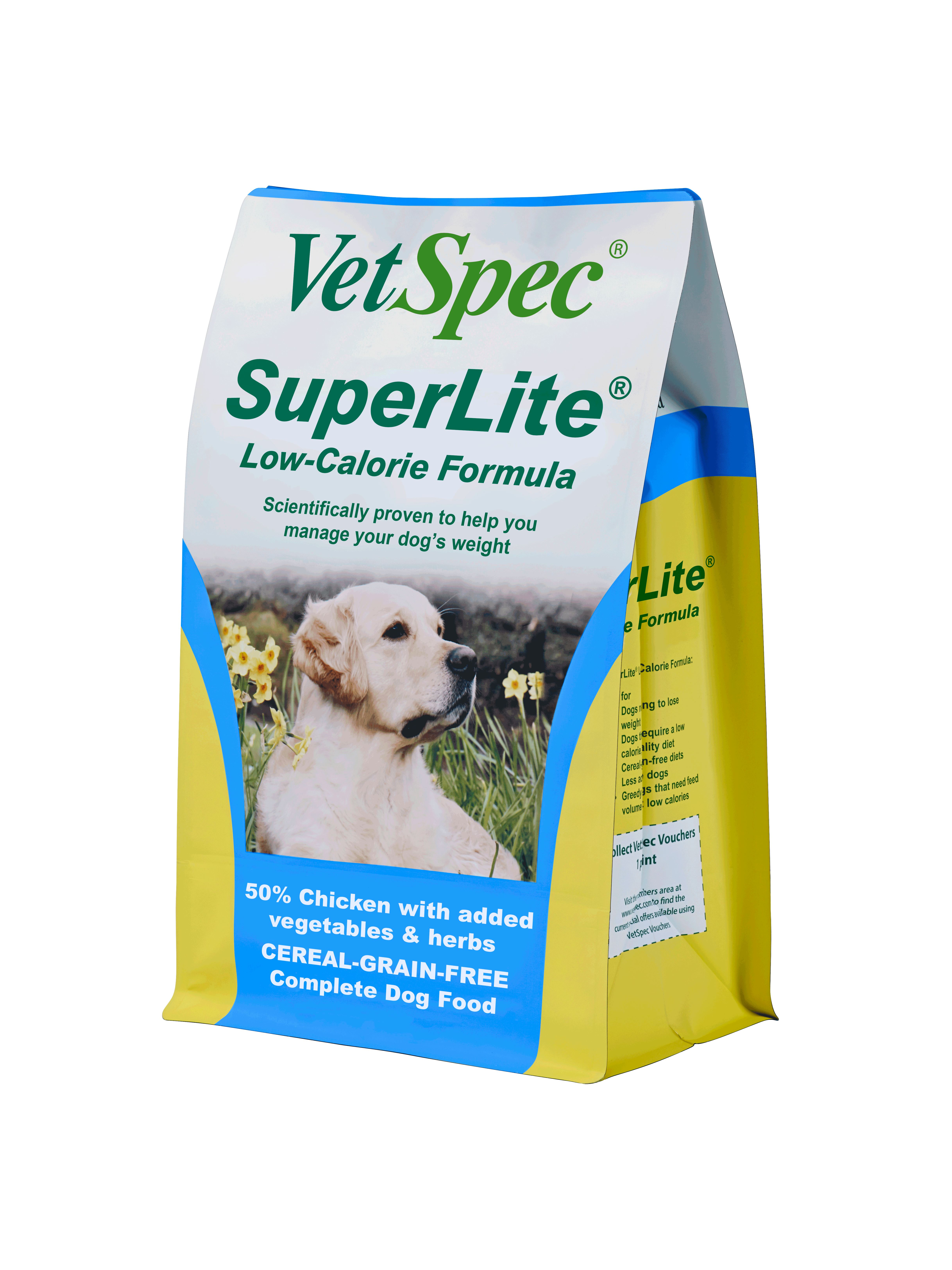 Latest research would indicate that up to 45% of all dogs are overweight and this can lead to clinical problems later in life. VetSpec SuperLite? Low-Calorie Formula has all the benefits of the supplements in VetSpec Healthy Dog Adult Formula but is on a base food with 20% less calories if fed as directed. This means that you can control your dog’s weight but still feed a delicious feed, packed with high quality vitamins and minerals, that your dog still needs on a daily basis. VetSpec SuperLite? Formula is an outstanding Veterinary Specification supplement in a CEREAL-GRAIN-FREE Super Premium dog food including 50% Chicken with added vegetables and herbs.