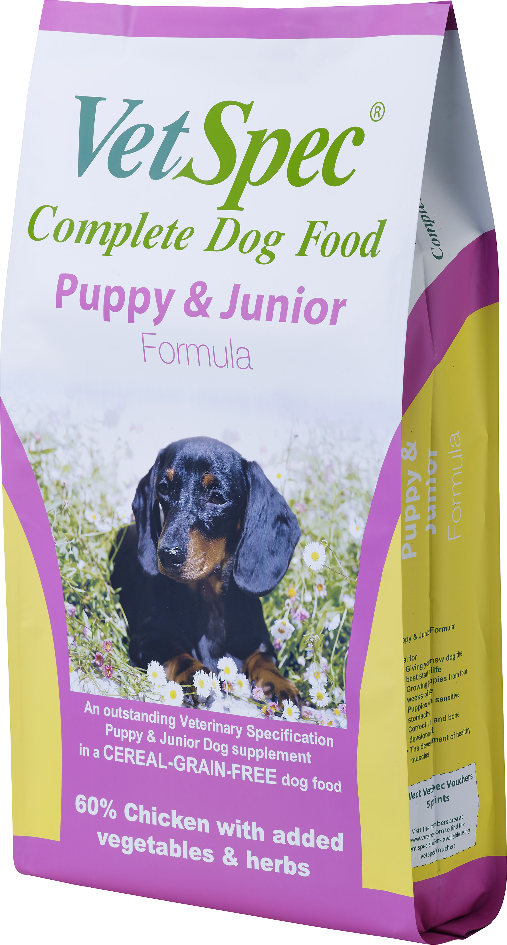 VetSpec Puppy and Junior Formula is a Veterinary Specification, CEREAL-GRAIN-FREE, Super Premium dry dog food including 60% Chicken with added vegetables and herbs. It is a completely balanced dog food suitable for all puppies and junior dogs from four weeks of age.
